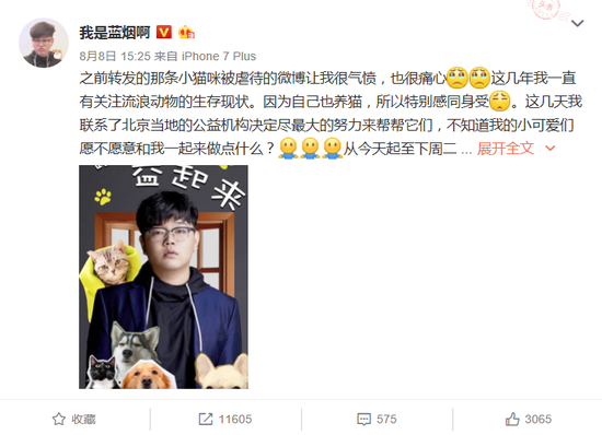 随后发微博表示,将捐赠10吨宠粮赠与“北京领养日”的民间公益领养组织,用于流浪动物的救助工作,引起万名微博网友关注和转载。粉丝们纷纷点赞,表示蓝烟“又可爱,又逗比,又帅,还有王者技术,重点还有爱心,这样的烟哥谁不爱?”