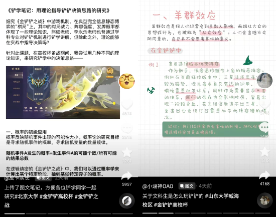 目前,已有不少小伙伴在社交平台中发布了他们的研究成果。例如代表山东大学备战铲铲高校赛的小涵神在抖音上发布“铲学笔记”,从羊群效应到巴莱多定律,把阵容克制写成了论文形式;来自北京大学的理科学霸皮卡,则以公式和模型的方式,灵活运用概率应用、数学期望等学科知识,发布了详实的对弈决策攻略,博得满堂喝彩,也带动了更多的高校学子参合到学术与运用的实践之中。