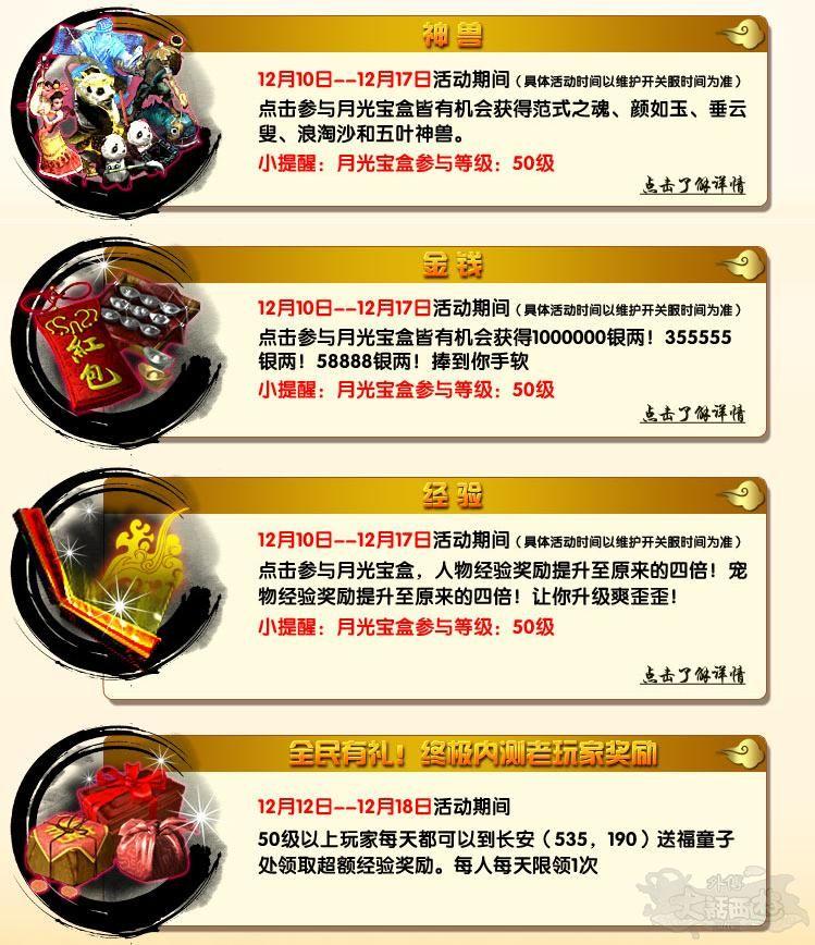 同时月光宝盒在庆祝终极内测期间开启穿越时间寻宝之旅,有机会获得神兽,大量银两、大量经验等奖励投放,见最下边的图片。同时内测期间,所有神兽丹炉开出的召唤兽经验提高4倍。