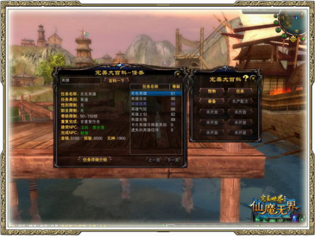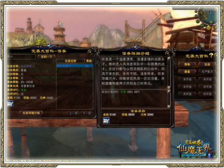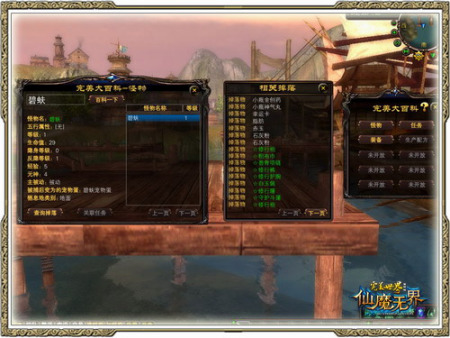 “完美大百科”目前由怪物、任务、装备3个部分组成,其他功能后续逐步开放,内容也将更加全面。当你点选列表中的怪物名称,你可以获得其相关信息,如:五行属性、等级、生命值、经验、元神等。并且你可以通过“查询掉落”查看此怪物的掉落信息。“关联任务”查看与此怪物相联系的任务;当你点选列表中的任务名称时,可以获得该任务的相关信息,如:任务所需等级、发放任务NPC、完成奖励等你最关注的信息。点选“任务详细介绍”还可以查看到此任务的任务说明;当你点选列表中的装备名称时,可以获得该装备的相关信息,如:图标样式、装备类别、性别、职业等级限制等,并且你还可以通过点选“掉落查询”查询到此装备可由何种怪物掉落产生。“可生成属性”可查询此装备可能产生的额外属性都有哪些。