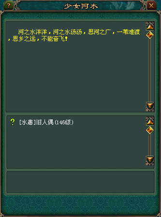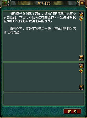 玩家组好队后,在杭州找到东门豹(143,89),通过对话进入水妖巢穴,除去为虎作伥的祝巫,打断对水妖的祭祀,救出无辜的少女。