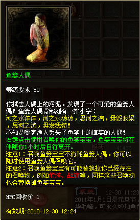 使用鱼篓人偶可以召唤出鱼篓宝宝,鱼篓宝宝无法参与战斗,但可以陪伴你渡过最多1小时。