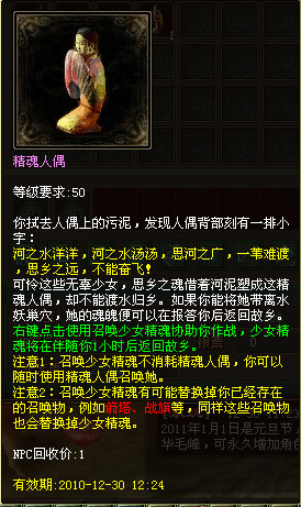 使用精魂人偶可以召唤出少女精魂,少女精魂可以协助你战斗最多1小时。