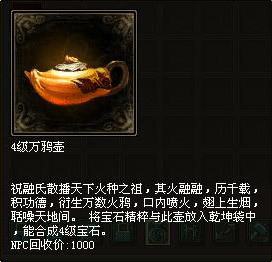 照妖镜任务若是照出了魔王,或是通乾龟,在他们死亡后会掉落1-5级万鸦壶。万鸦壶用于与宝石精粹合成新的宝石。