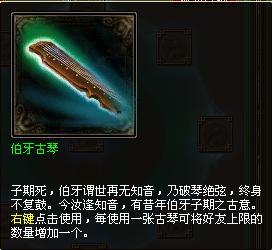 雷峰塔中的怪物有一定几率掉落道具“伯牙古琴”。使用后可将好友数量上限增加1个,最多可把好友数上限增加到200个。