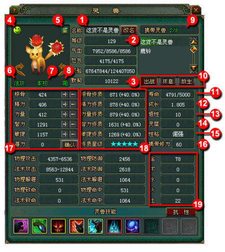 潜力:灵兽每升一级会获得5点潜力,可以任意分配到根骨、敏捷、力量、智力和精力五项上,确认后生效。