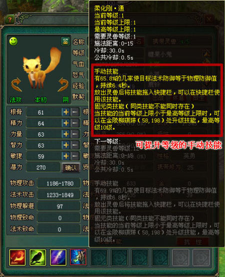 当前等级:随灵兽的默契值变化的数值,灵兽默契度越高,技能当前等级越高。当前等级永远小于等于当前等级上限。