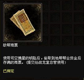 领取任务后会要求你去截获一张商票用于充实帮会资金,届时你去杀死一名他帮的商人获取商票即可完成任务。完成任务后会奖励一个绑定且限时的“六根清净竹”道具以便你洗去红名。