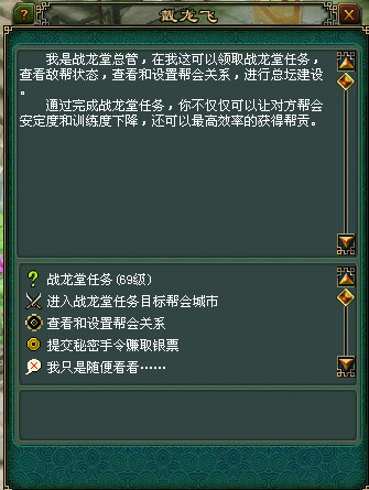 帮中成员可以找到战龙堂总管,通过对话领取任务。如果没有设置重点敌对帮会将会随机分配一个目标帮会给玩家。