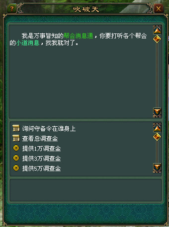 如果你要知道是哪个守卫持有守备令,则需要到杭州去找吹破天大人询问,吹破天大人是个贪财的人,你要付出一定的钱才可能探听到正确消息,当然被探听的帮会也可以付钱来让吹破天大人守住口风,最终就看你们2个帮会谁的经济实力强了。