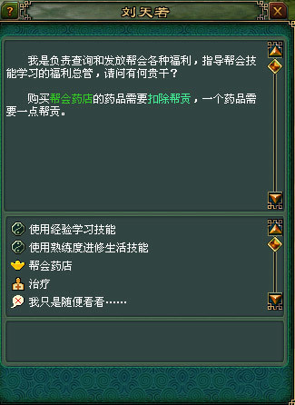 玩家可以到帮会药房附近的刘天若选择学习技能来学习帮会技能和生活技能。