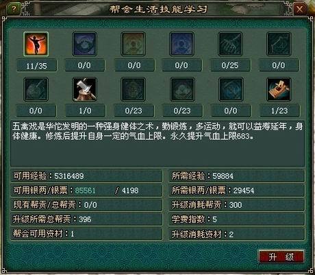 帮会修炼会消耗资材,如果帮会中资材过少,则有可能很多帮众都没法修炼。修炼资金的10%会加入到帮会资金中,也是帮会资金的重要来源。如果资材消耗过大,帮会中有权限的成员可以在内政界面调整学习指数到10来让学习技能的银两费用翻倍。