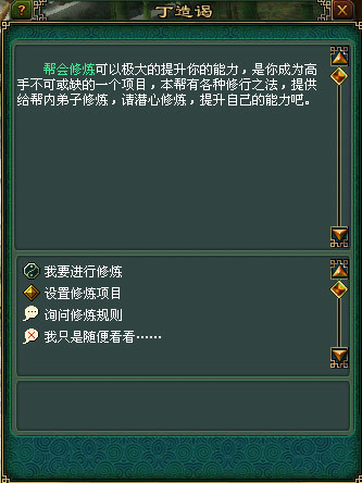 修炼也在帮会中投放,帮会中有权限的人可以设置修炼项目,开放修炼的项目数量和帮会规模相关。