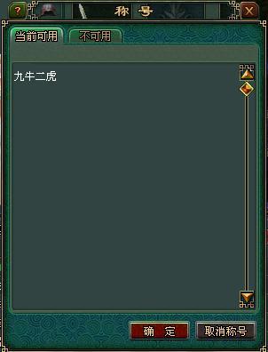 下图就是称号界面。在当前可用的称号中选择一枚,并点击确定,就可以把这个称号佩戴到人物身上,其他玩家也可以看见。