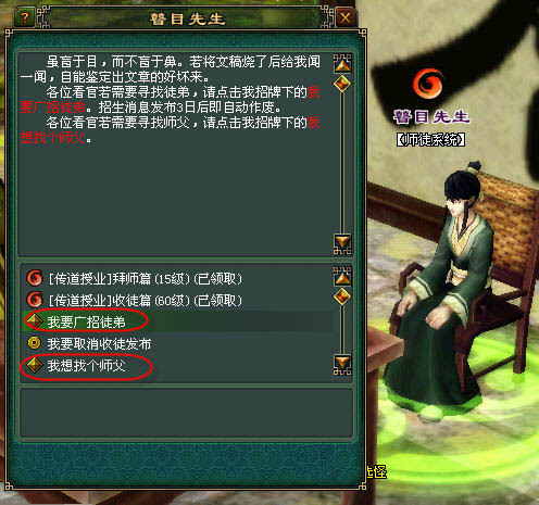 (想要寻找徒弟和或师父,可查看王夫子附近的瞽目先生。)