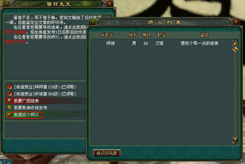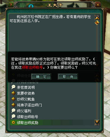 确立师徒关系的玩家,如果不准备再作对方的师父/徒弟,可以在出师前单独去找陆夫子,解除当前的师徒关系。