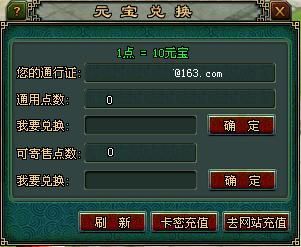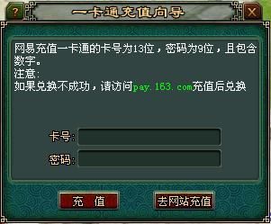 方法三:拥有网银的玩家,可在“网易一卡通充值服务中心”(链接:http://ecard.163.com/ ),选择“给网易通行证账号充值通用点数”,登录游戏后即可兑换元宝进行消费。