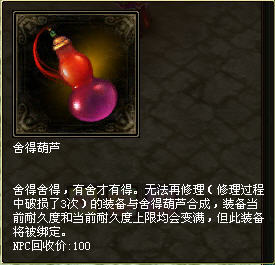 当前破损次数达到最大破损次数时,即修理失败3次,装备不能再修理,且装备的当前耐久度和当前耐久度上限等于0,此时玩家可去商店购买一个道具——舍得葫芦,该道具可使修理失败的装备的当前耐久度和当前耐久度上限达到原始耐久度上限,且装备变为绑定。
