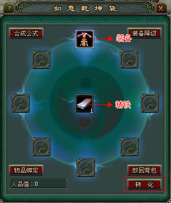 玩家可以通过打怪来获得装备,并有一定的几率获取带颜色的装备,打金怪和橙怪时将有更大的几率获取带颜色的装备,当然,打BOSS时的几率将更大。此外,玩家也可以通过乾坤袋合成需要的装备,合成时,自身的幸运越高,放入的装备越好,得到带颜色装备的概率越高。另外,踢箱子也能获取装备。