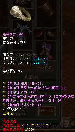 戒指的属性,在底部显示失魂状态,失魂截止时间,单天修理价格(这个价格在后面会有解释)。