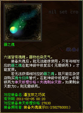2. 使用魂兮归来修复失魂装备,要收取银两,价格为单天修理价格×失魂剩余天数。