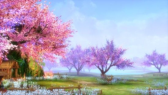 随风飘浮的桃树林,犹如世外桃源般的小木屋,仙人也会留恋这幅美景吧