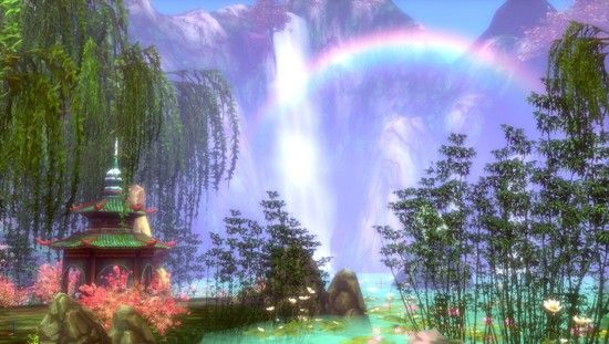 高山流水,瀑布彩虹,片片荷叶,还有那岸边的亭台,仙境也不过如此了
