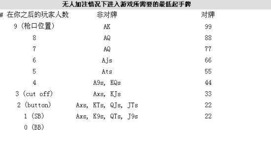 AA,KK,QQ,JJ,TT,AK,AQ,同花KQ,同花AJ,下同样数量的赌注,通常为大盲注的8倍,1/2游戏中为下注16,5/5游戏中下注为40,5/10游戏中下注为80,依此类退。