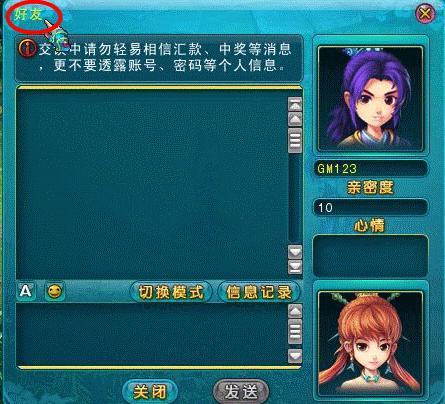 打开好友界面,在列表中用左键点选要发信的好友名称,弹出信息界面后输入信息内容,再点 "发送"即可。如果对方在线,并且信息开关开启,就可以马上收到信;不在线的话可以在下次登陆时收到。
