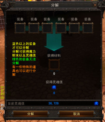 打开分解界面后,右键点击背包内的装备可放置如分解框中(不符合要求的物品无法放置进去),分解可获得的魔力粉末数量以及灵魂值会显示出来。