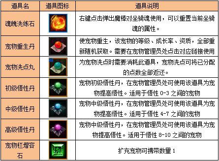此类道具用于辅助宠物和坐骑成长。
