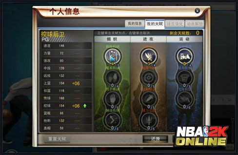 在《NBA2K Online》的“个人信息”界面,有一个“我的天赋”页,这里就是进行天赋加点的管理页面了。玩家可以在这里通过对天赋点不同的分配,使自己的角色在某些方面的能力得到提升。但是需要值得特别注意的是,球员拥有的天赋点是不能将自己的所有天赋点完的!这就需要您在对天赋加点的时候,集中一系,使自己的能力更有倾向性,这样才能突出某一方面的能力。