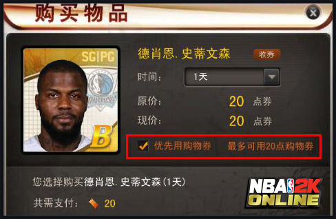 点击“购买”按钮后,会弹出购买界面。记得一定要勾选“优先用购物券”,这样才会优先扣除玩家的购物券。