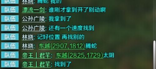 挖宝技巧:由于范围很大,植被繁多。有些阵眼位置并不好找。那么每次找到阵眼之后在小队频道里报出名称和坐标。这样找到一个阵眼后马上帮助其他队友,大大提高寻宝速度。点击坐标玩家会自动回到坐标位置。