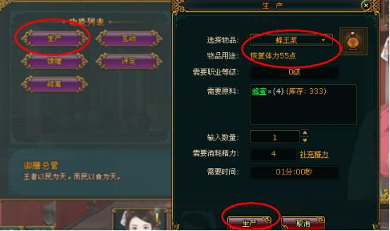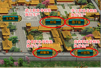 到皇宫地图上找到相应职业导师场景点,进入后,点击职业导师,在出现的功能列表中点击“生产”。如下图: