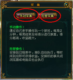 采集原料:到世界地图上找到相应的原料点(本职业可采集的原料),点击后出现手动采集和托管采集两个选择。如下图: