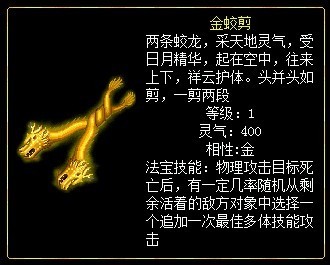 金蛟剪:物理攻击目标死亡后,有一定几率随机从剩余活着的敌方对象中选择一个追加一次最佳多体技能攻击。