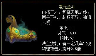 混元金斗:有一定几率出现物理攻击力提升2.5倍,配合力破千钧时对辅目标物理攻击力提升2倍。但不与连击、必杀、死亡缠绵叠加。