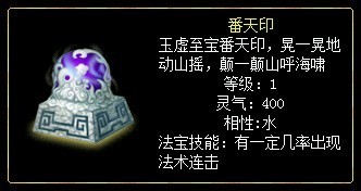 番天印:有一定几率出现法术连击。连击的技能从不高于施法的技能阶次中随机选择一种技能。