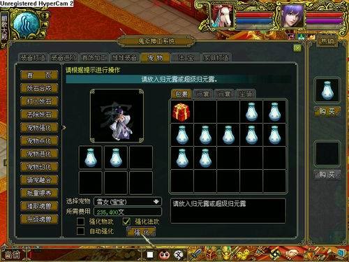 2、将要强化的宠物放置在上方的空格内,将归元露或超级归元露放置在下方的空格内,然后勾选你想要强化的方向。最后点击“强化”按钮,即可对宠物进行强化操作。
