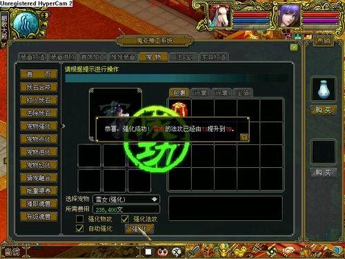 3、强化成功后,宠物所强化的成长有一定的提升,并且后缀将有变化,精怪强化后变为“精灵”、御灵强化后变为“御仙”,宝宝强化后变为“强化”。