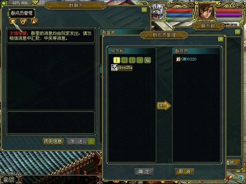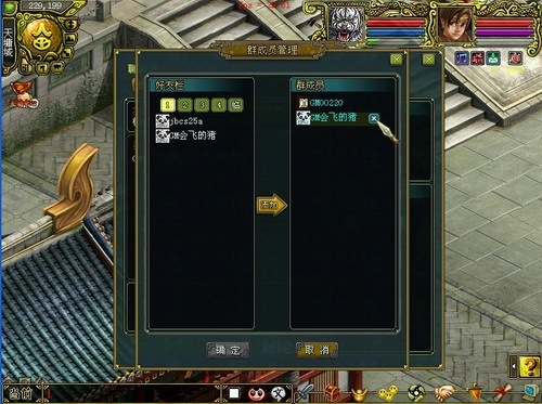 1、玩家打开群成员管理界面,选中其中一个好友,点击中间的“加入”箭头,或者从左边的“好友栏”将玩家名片拖动到右方“群成员”列表中即可邀请玩家加入群。