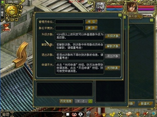管理员在群界面点击“群管理”按钮打开群管理界面,会有一个传位项,玩家在输入框中输入想要传位的玩家的名字,点击“传位”按钮,即可将管理员传位给具有当前群类型管理权力的玩家。