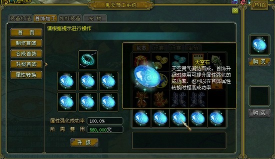 3、首饰升级成功时首饰中随机一条属性获得强化提升,玩家可以投入天空石可以增加成功几率。