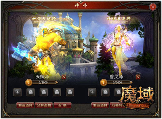 经过内测的探索,小编发现游戏中的神仆,并非传言中的第四宠,而是一个全新的系统。点击神仆按钮,会发现神仆还分为天赋师和兽灵师两种。它们都拥有着“分解”和“制造”的强大能力,闲置的装备物品通过神仆的加工,既可成为新道具的基础材料,又可作为附魔加战的助燃剂,这让每件装备和材料都变得价值非凡。