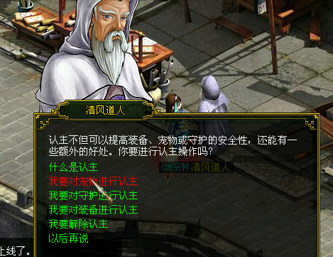 玩家可以通过提供认主功能的清风道人,给装备、宠物、守护进行认主。