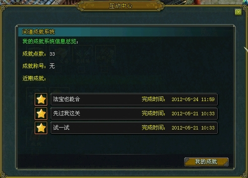 进入互动中心-成就系统后可以查看到自己的成就点数、成就称号和近期完成的成就: