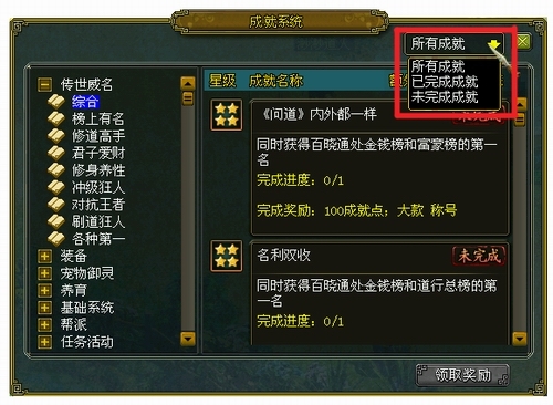 2、所有成就处的下拉框可选择搜索已经完成的成就项和未完成的成就项,便于玩家去完成成就~