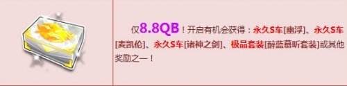 仅需8.8Q币,在商城购买“S车召唤盒”,开启就有机会获得永久S车(幽浮/麦凯伦/诸神之剑)、极品套装、极品翅膀、极品手杖或其他奖励之一。