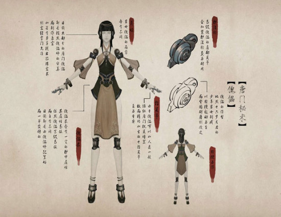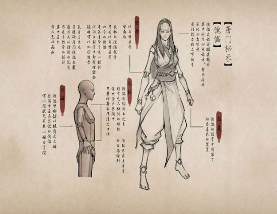 头雕:男女傀儡的面容各有不同,目前大部分的唐门傀儡都是按照傀儡师的审美而制作五官,如若有弟子提出特殊需求则需经掌门允准。